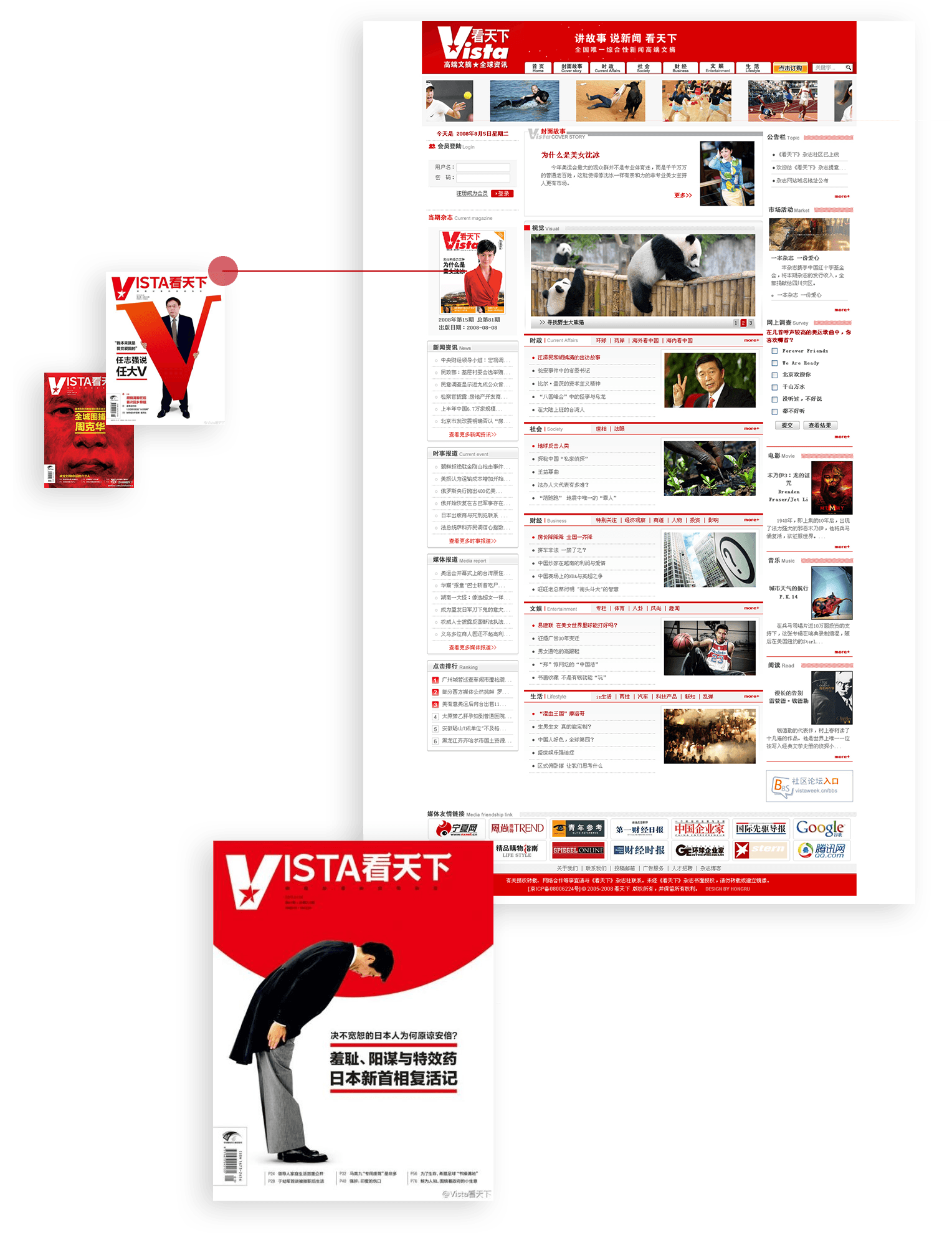 網站與雜志相輔相成,設計風格上有異曲同工之妙。同時通過訂閱功能和微博同步窗口,幫助《看天下》更便利的“說新聞,講故事”,進一步擴大在主流