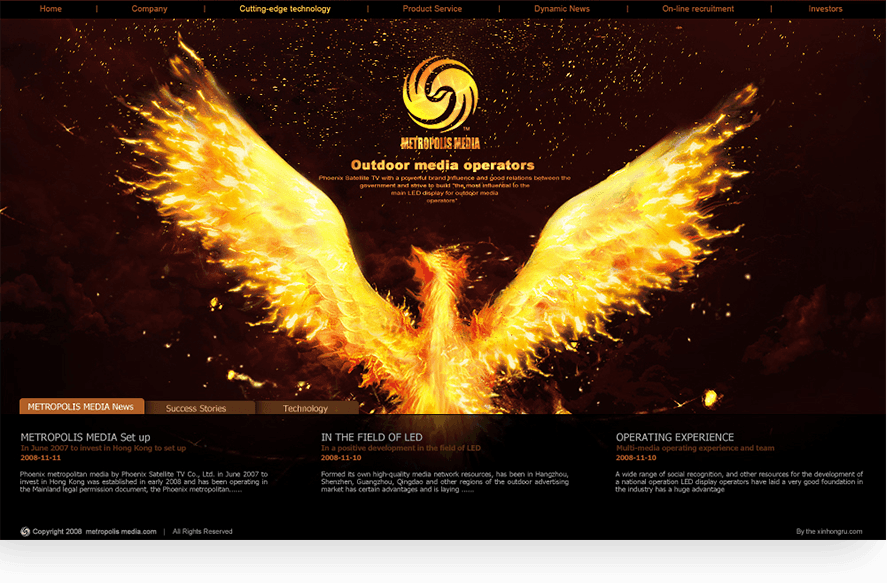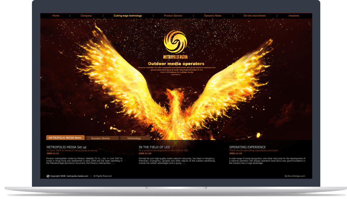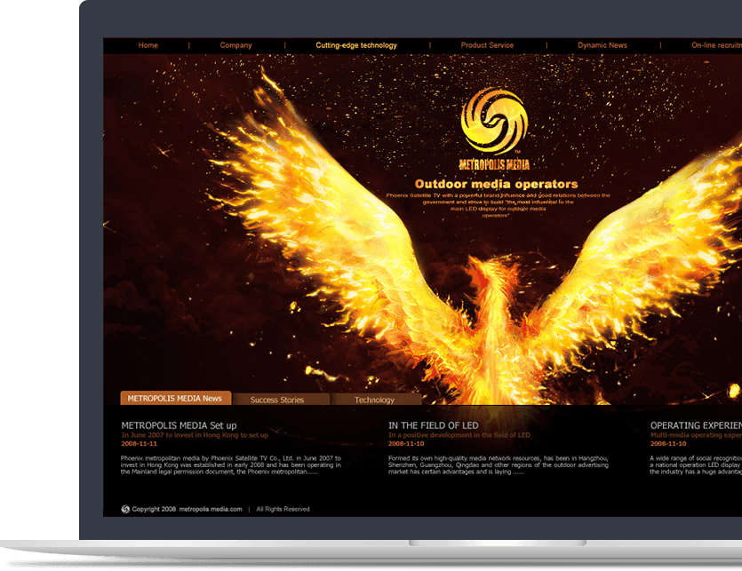 官網(wǎng)以鳳凰傳媒的標(biāo)志性圖標(biāo)和鳳凰圖案作為創(chuàng)意靈感,通過(guò)熾熱的火鳳凰表現(xiàn)鳳凰都市傳媒澎湃的新聞熱情和敢于承擔(dān)的社會(huì)責(zé)任。頁(yè)面視覺(jué)感官效果和鳳凰都市傳媒品牌調(diào)性高度吻合,成為鳳凰都市傳媒在互聯(lián)網(wǎng)領(lǐng)域閃亮的名片。
