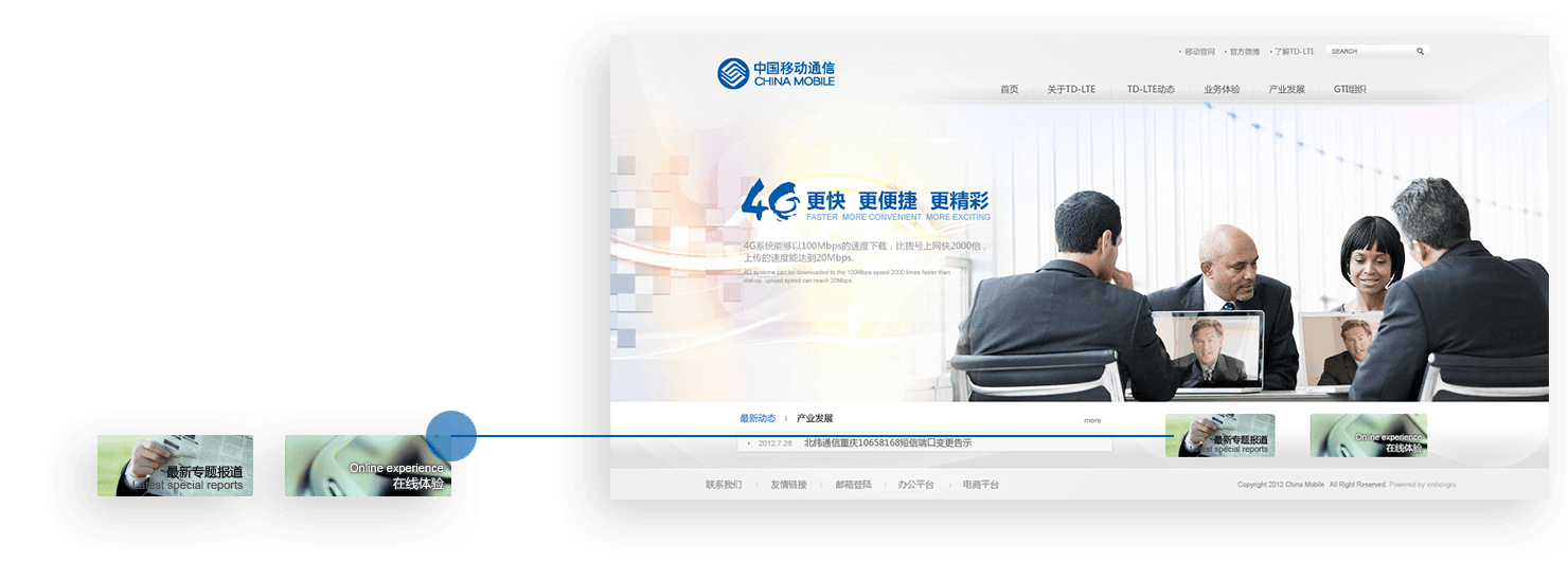 新鴻儒為中國移動提供整體的官網建設服務,從前期的策劃到設計、制作、開發以及運維,